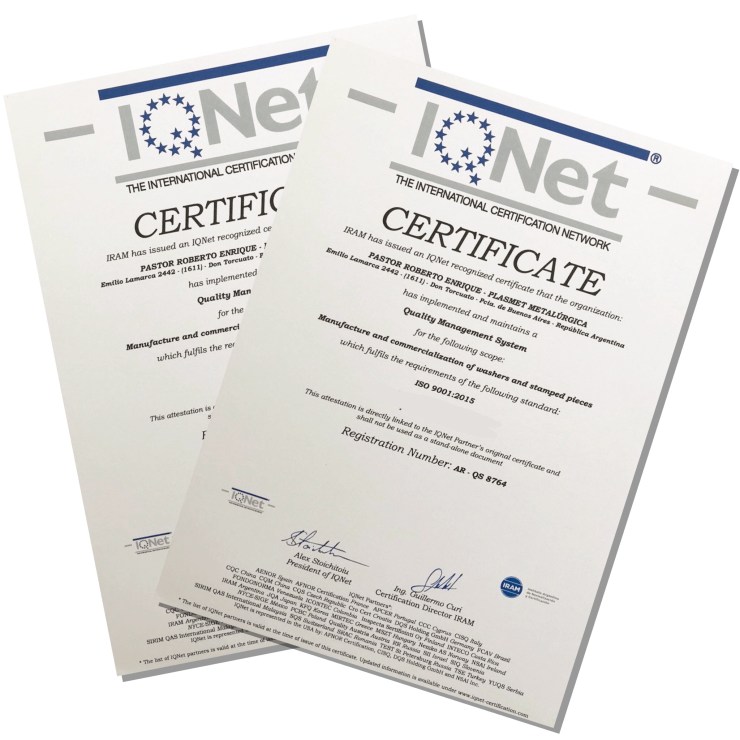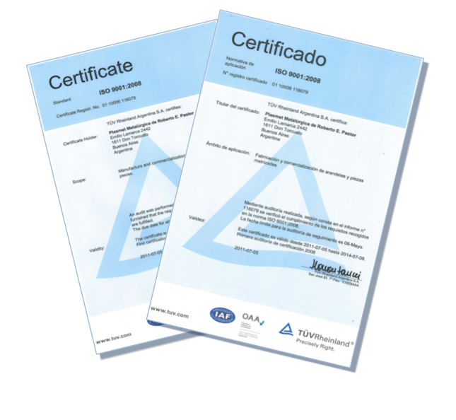PLASMET Metalúrgica es una empresa certificada hace mas de cinco años que ha implementado el sistema de gestión de la calidad.